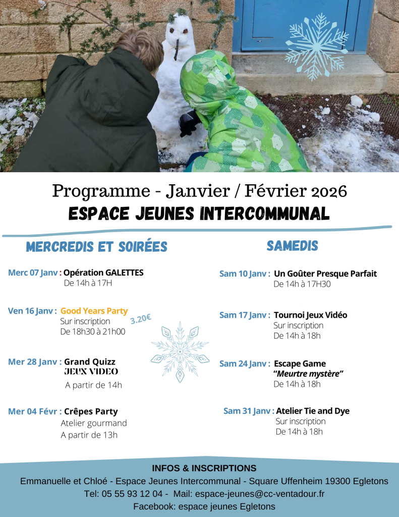 Lieu : Egletons Espace Jeunes Square Uffenheim 19300 Egletons Tél. : 05 55 93 12 04 Email : espace-jeunes@cc-ventadour.fr Facebook : https://www.facebook.com/espacejeunesegletons